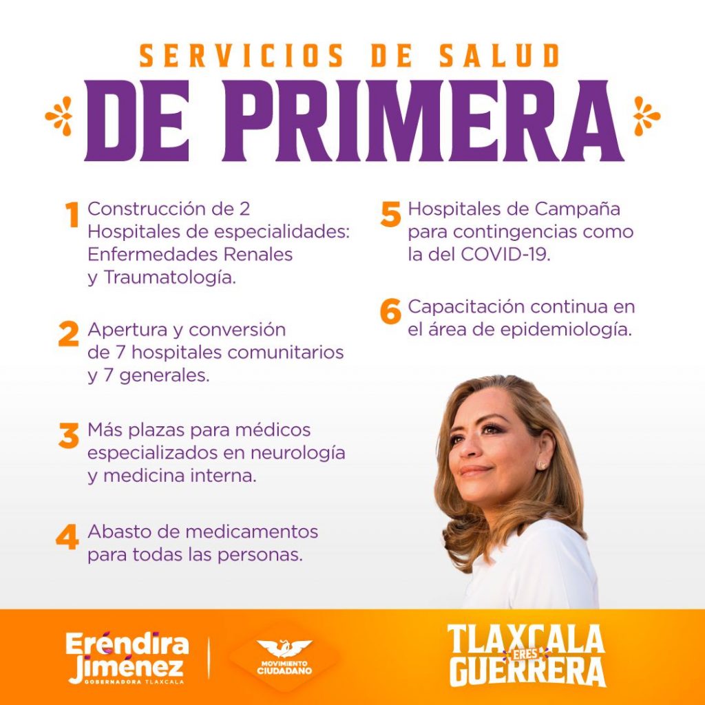 Al destacar que la contingencia sanitaria por COVID-19 puso en evidencia la capacidad de respuesta para enfrentar una emergencia de esta magnitud, así como el desabasto de medicamentos y falta de personal médico, la candidata a la gubernatura del estado de Tlaxcala por Movimiento Ciudadano (MC), Eréndira Jiménez, reiteró sus primeros seis compromisos en materia de salud, para garantizar servicios de primera a las familias tlaxcaltecas.