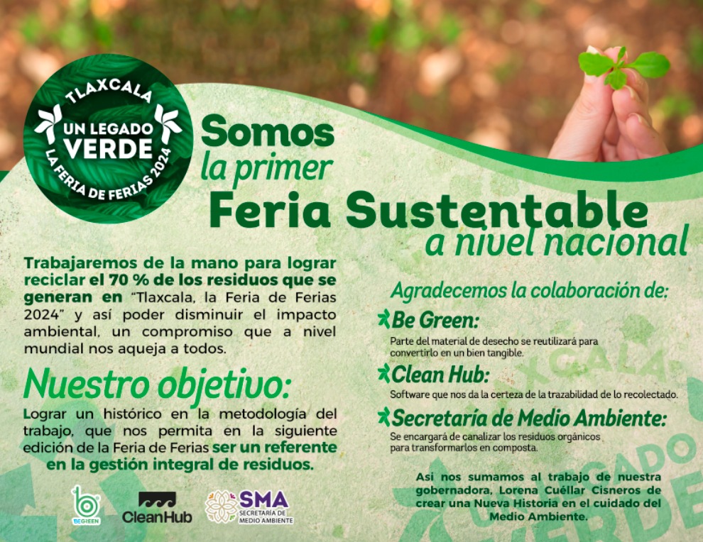 Nava García Méndez Señaló que en coordinación con la empresa alemana Clean Hub, la mexicana Be Green y la Secretaría de Medio Ambiente, que dirige Pedro Aquino Alvarado, se logrará reciclar el 70% de la basura que se recolecta durante esta Feria 2024.