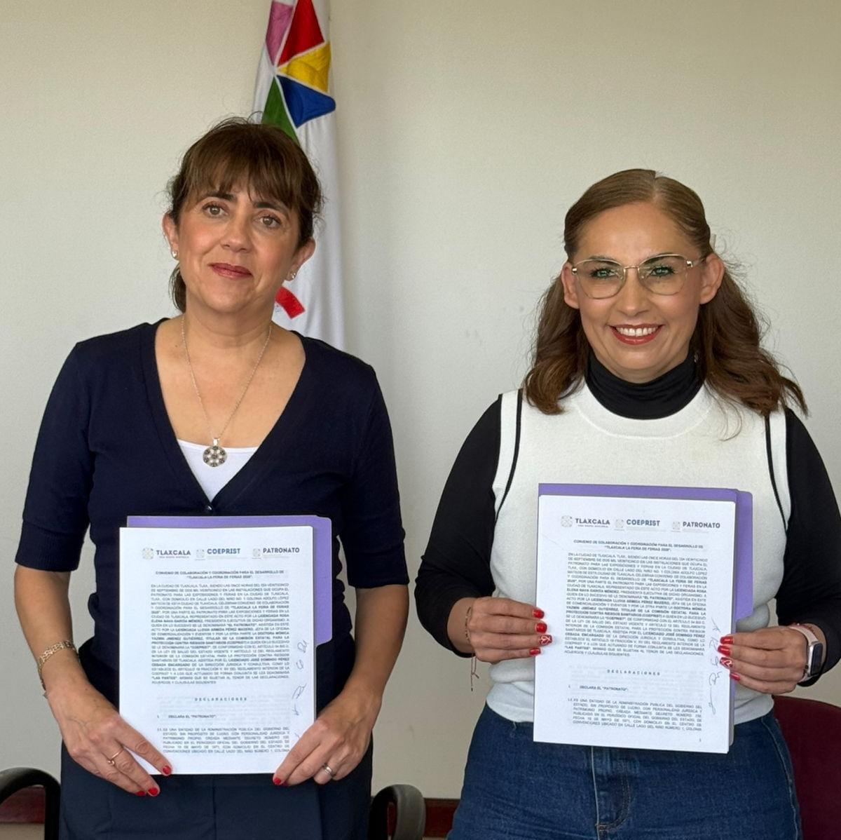 En el acto protocolario, Rosa Elena Nava García Méndez, presidenta ejecutiva del Patronato, y Mónica Yazmín Jiménez Gutiérrez, titular de la Coeprist, destacaron que esta coordinación permitirá que la Feria de Tlaxcala se desarrolle en condiciones seguras para los miles de visitantes y familias y que arriban cada año a disfrutar de las actividades culturales, artísticas, recreativas, comerciales y gastronómicas.