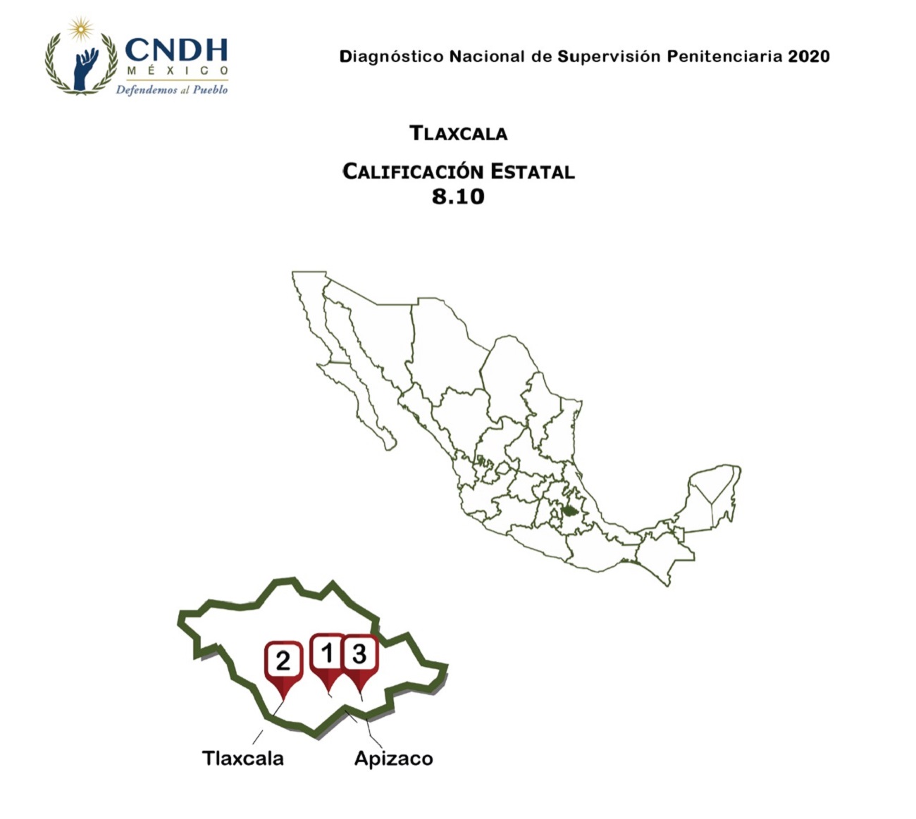 Cabe mencionar que, derivado de la operación eficiente del sistema penitenciario en la entidad, la SSC ha logrado desde 2011 una calificación aprobatoria, particularmente, de 2018 a 2020, Tlaxcala se ha mantenido en los primeros lugares en el Diagnóstico Nacional de Supervisión Penitenciaria.