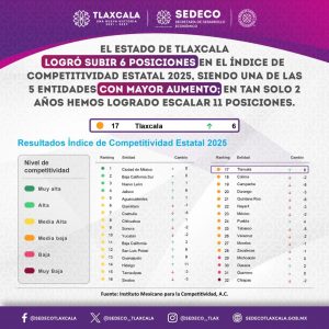 Tlaxcala, Tlax; 11 de junio de 2025 (PulsoRed) Tlaxcala fue uno de los 11 estados del país que subió posiciones en el Índice de Competitividad Estatal (ICE) 2025, publicado por el Instituto Mexicano para la Competitividad (IMCO), debido a que mejoró su desempeño en los indicadores que miden la capacidad estructural para generar, atraer y retener talento e inversión.