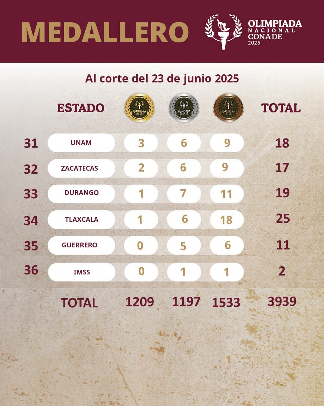 Tlaxcala, Tlax; 25 de junio de 2025 (David Rodríguez) Después de 37 días de competencias en diferentes disciplinas deportivas, la delegación Tlaxcala se ubica en la posición 34 de las 36 participantes en la Olimpiada Nacional Conade 2025.