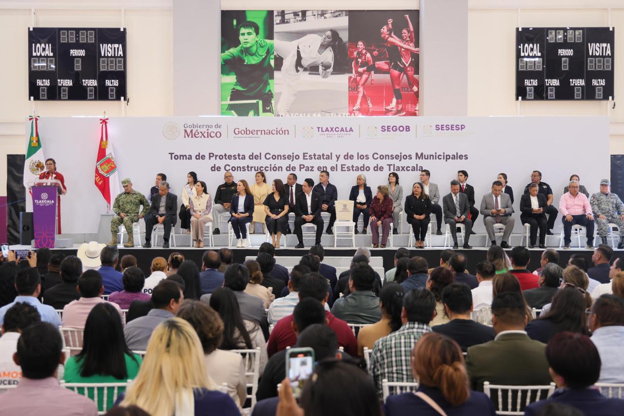 Tlaxcala, Tlax; 28 de octubre de 2025 (PulsoRed) En la Ciudad Deportiva de Alto Rendimiento de Tlaxcala (Cedart), la gobernadora Lorena Cuéllar Cisneros tomó protesta a los Consejos Estatal y Municipales de Paz, Justicia Cívica y Reconstrucción del Tejido Social, con lo que Tlaxcala se convirtió en el primer estado del país en integrar plenamente este modelo nacional de participación ciudadana y seguridad comunitaria, al contar con las actas avaladas en los cabildos de los 60 ayuntamientos.