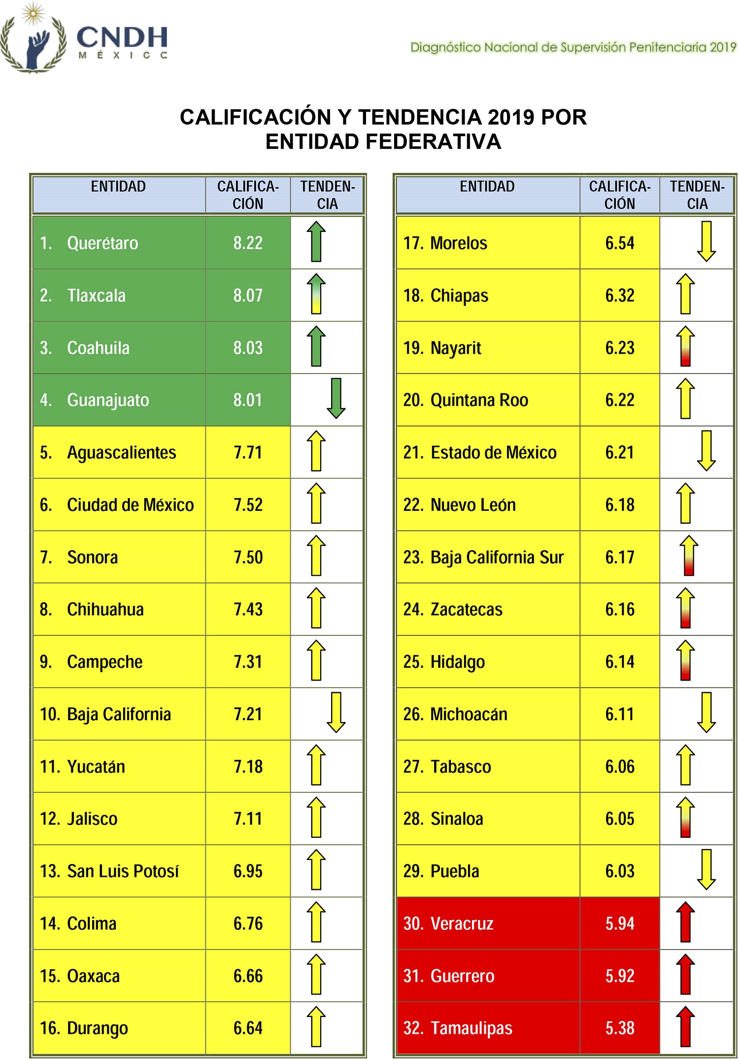Tlaxcala, Tlax; 12 de noviembre de 2019 (Pulso) Con una calificación de 8.07 y una tendencia al alza, Tlaxcala a través de la Dirección de Prevención y Reinserción Social de la Secretaría de Seguridad Ciudadana (SSC) obtuvo el segundo lugar en el Diagnóstico Nacional de Supervisión Penitenciaria (DNSP) 2019, que realiza la Comisión Nacional de los Derechos Humanos (CNDH).