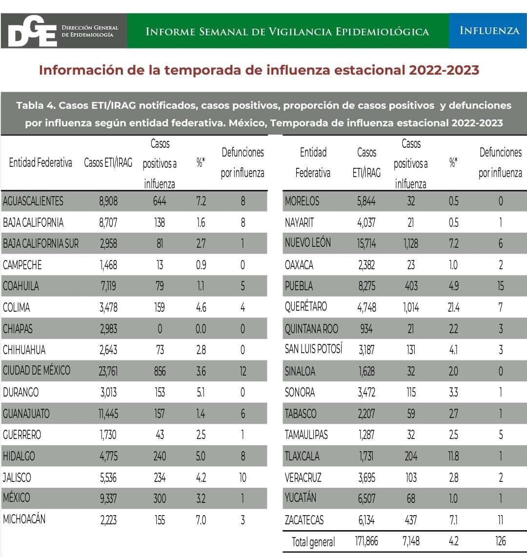 El mismo documento, señala que a nivel nacional se sumaron 126 defunciones por dicha enfermedad, Puebla fue el estado que presentó la mayor cantidad con 15 fallecimientos, seguido por la CDMX con 12, Zacatecas con 11 y Jalisco con 10. En tanto, Tlaxcala se mantuvo con una defunción.