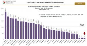 Tlaxcala, Tlax; 24 de septiembre de 2025 (PulsoRed) De enero a agosto de este año, Tlaxcala fue el estado con menor incidencia delictiva en México, con una tasa de 121.1 delitos por cada 100 mil habitantes, de acuerdo con el más reciente informe del Secretariado Ejecutivo del Sistema Nacional de Seguridad Pública (SESNSP).