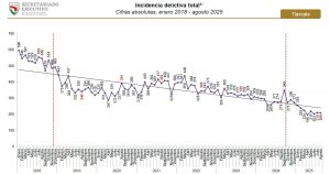 En enero de 2025, se denunciaron 255 delitos; en febrero, 239; marzo, 224; en abril, 196; en mayo, 219; en junio, 202; en julio, 210; y en agosto, 208. Estas cifras son las más bajas desde el comienzo del reporte que data del mes de enero de 2018, cuando la incidencia fue de 596 delitos.