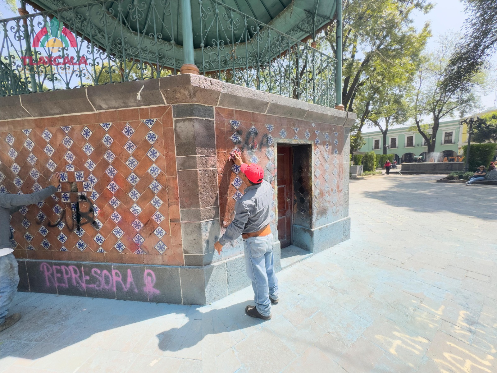 Los trabajadores del Ayuntamiento trabajan desde la madrugada del pasado domingo en labores de mantenimiento, siguiendo los lineamientos de las dependencias responsables del cuidado y conservación de los bienes inmuebles de Tlaxcala, con un enfoque en la preservación del patrimonio histórico y la seguridad de los habitantes y visitantes de la ciudad.