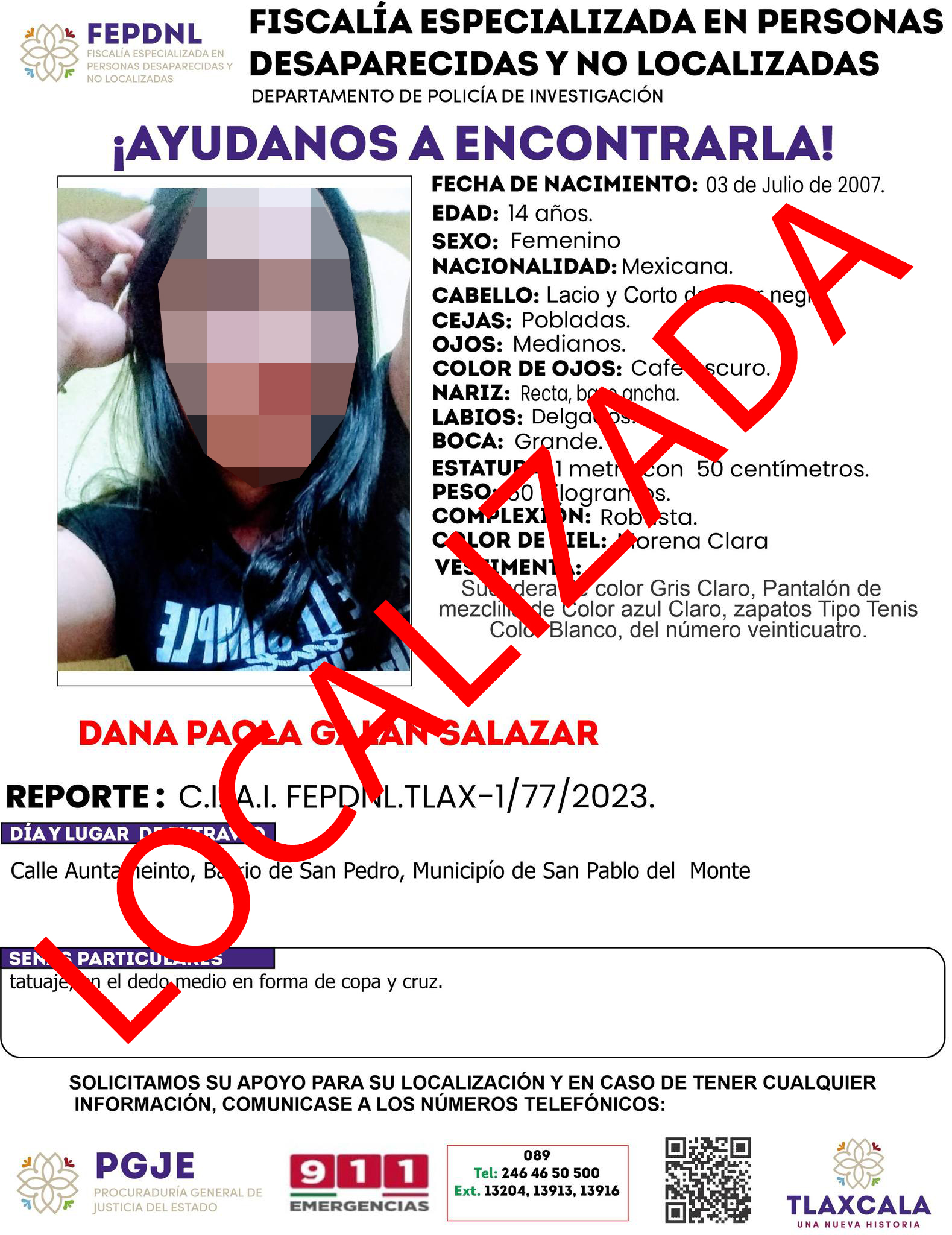 Derivado de la denuncia presentada por los familiares de la adolescente, elementos de Investigación ejecutaron labores de búsqueda por el municipio de Papalotla, donde observaron a una persona con las características fisionómicas reportadas de la menor desaparecida.