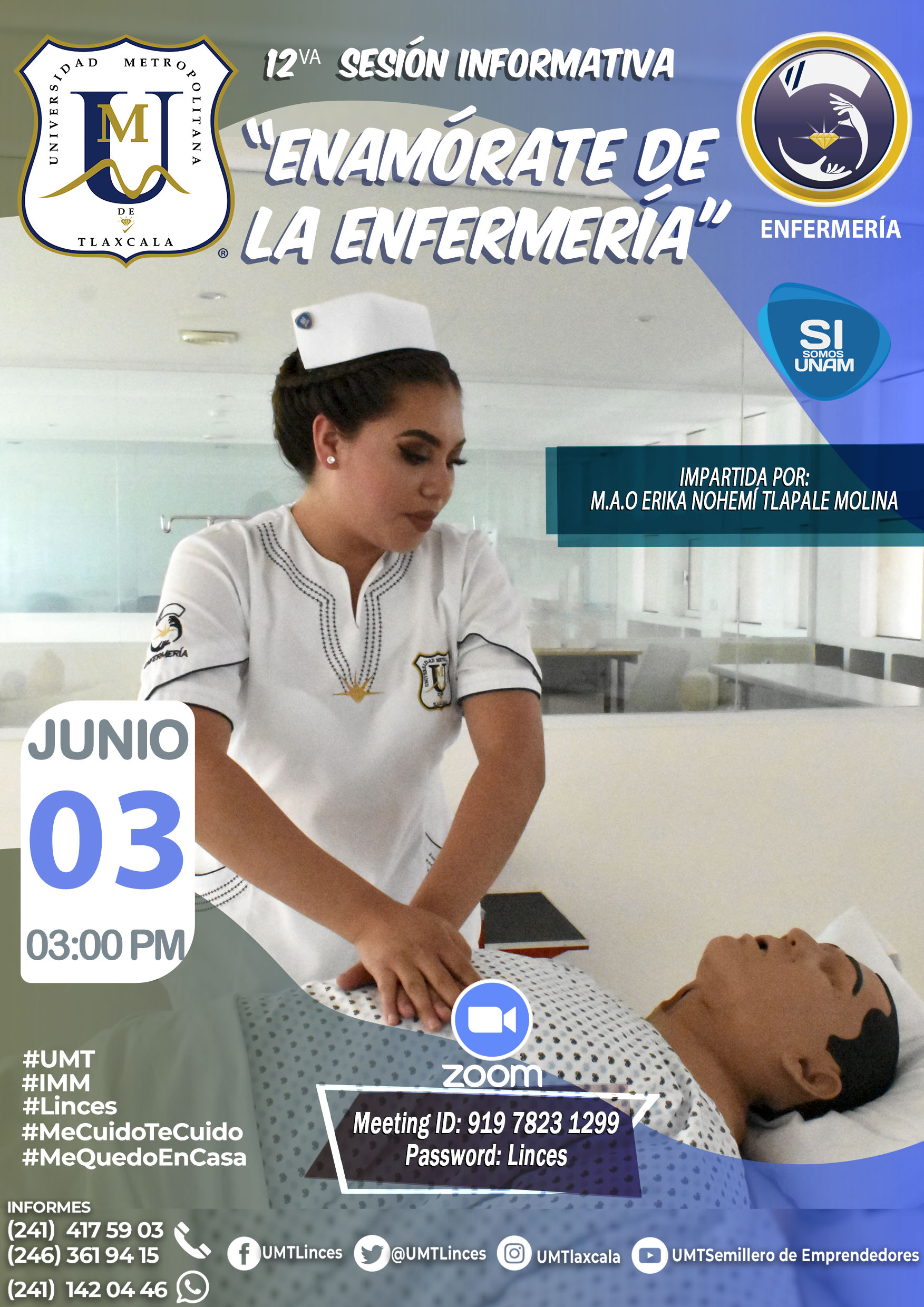 Twitter ¿Te gustaría estudiar enfermería en la mejor universidad del Estado? Únete a la sesión informativa digital de la Universidad Metropolitana de Tlaxcala. Conoce todos los detalles de la Licenciatura en Enfermería incorporada a la UNAM. Liga de acceso: https://zoom.us/j/91978231299?pwd=UFBUakVVaVdwSHRxa1B3VVJVZkUzUT09 Navegación de entradas Firma IMSS convenio de colaboración con la UNAM-Zaragoza Acompañó Anabel Alvarado en su cierre de campaña a Raúl Pérez Corona