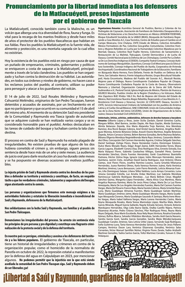 “La injusta prisión de Saúl y Raymundo atenta contra los derechos de los pueblos a defender su territorio y existencia y constituye, de facto, un respaldo tácito a que los verdaderos criminales, talamontes y saqueadores del bosque, sigan atentando contra lo común. Exigimos a las autoridades federales y estatales la liberación inmediata e incondicional de Saúl y Raymundo, defensores de la Matlalcuéyetl”.
